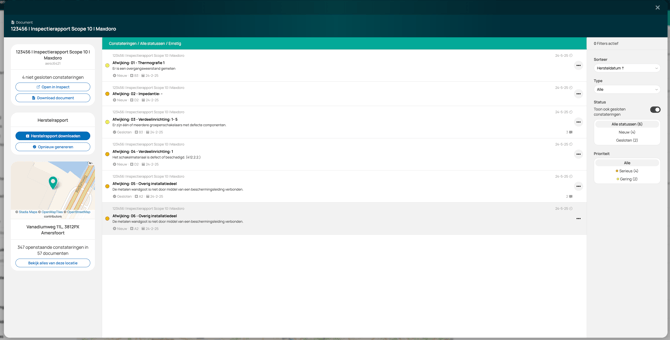 Het herstelrapport bevat een inhoudsopgave met een overzicht van alle afwijkingen. Deze inhoudsopgave is aanklikbaar, zodat je eenvoudig kunt navigeren naar individuele afwijkingen. Daarnaast bevat het rapport een ‘Gegevens’-hoofdstuk met een samenvatting van alle afwijkingen. Tot slot bevat dit rapport ook de individuele afwijkingen zelf met eventuele herstelwerkzaamheden.
